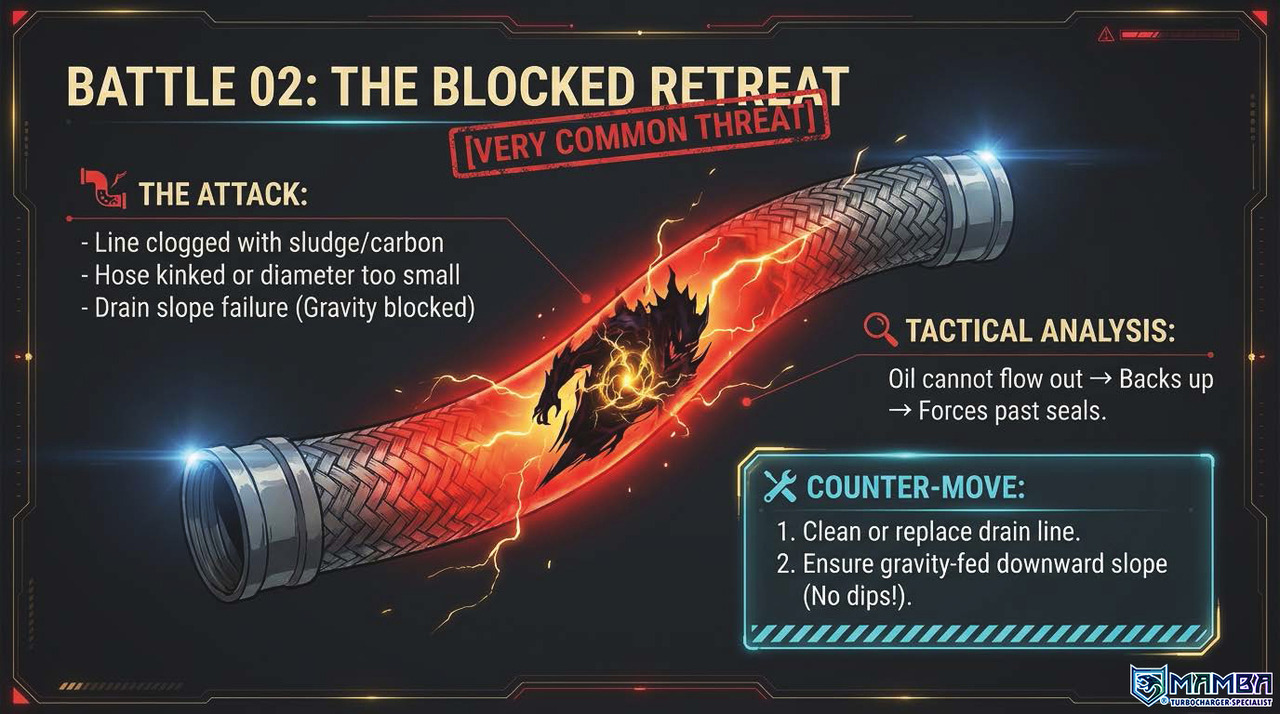 Burnt oil turns into carbon → blocks drain → kills seals